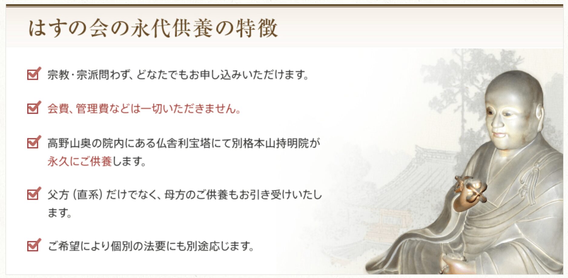 入会後の金銭的な負担がいっさいない点も、多くの方に選ばれている理由のひとつです。持明院「はすの会」では、最初に案内されるご供養プランの費用以外に、年会費や管理費を支払う必要はありません。
